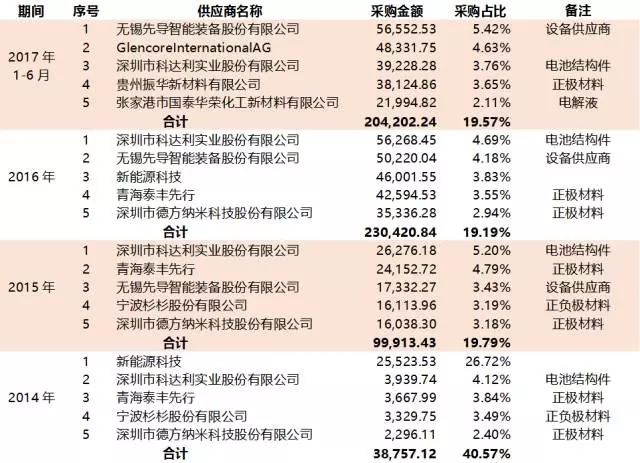 表10:2014年~2017年1~6月寧德時(shí)代前五大供應(yīng)商(單位:萬元)