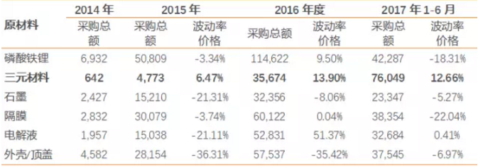 ?公司正極材料為磷酸鐵鋰和三元材料。報(bào)告期內(nèi),磷酸鐵鋰平均采購(gòu)價(jià)格呈波動(dòng)變化;三元材料價(jià)格平均采購(gòu)價(jià)格逐年升高,主要原因?yàn)樘妓徜噧r(jià)格的上漲,以及 2016 年至 2017 年間鈷金屬價(jià)格的上漲。