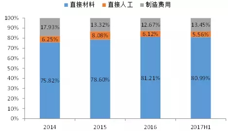 公司主要的原材料中,除了三元正極材料外,均價(jià)均維持下降趨勢(shì)。而在2017年由于鋰、鈷價(jià)格大幅上漲,帶動(dòng)三元正極材料價(jià)格大幅上漲,我們測(cè)算公司三元電池原材料成本有明顯上升。
