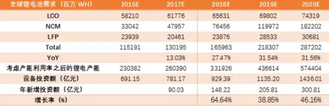 正極、結(jié)構(gòu)件、設(shè)備最為受益寧德時(shí)代上市:參照招股說明書,設(shè)備類、正極材料和結(jié)構(gòu)件的單一公司采購(gòu)金額較大。假設(shè)2020年寧德時(shí)代出貨量為50GWh(其中磷酸鐵鋰電池10GWh,三元電池40GWh),其對(duì)于三元正極材料需求有可能超過150億,結(jié)構(gòu)件的需求約為50億,而電解液、濕法隔膜的需求約為30億,磷酸鐵鋰需求約為20億。受益企業(yè)包含杉杉股份、長(zhǎng)園集團(tuán)、璞泰來、天賜材料、江蘇國(guó)泰等。而如果根據(jù)CATL已有產(chǎn)能規(guī)劃,公司到2020年總產(chǎn)能有望達(dá)到80GWH,也即意味著將拉動(dòng)約1/4的設(shè)備投資需求,2017-2020年投資總規(guī)模約達(dá)到180億,期間CAGR達(dá)到50%。根據(jù)招股說明書的披露,前段、中段、后段設(shè)備投資占比約為5:3:2,前段與中段價(jià)值量大、技術(shù)壁壘高,更有可能誕生設(shè)備龍頭。