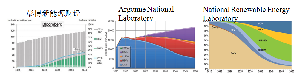 就這張圖來(lái)看,彭博新能源和阿貢能源實(shí)驗(yàn)室他們看好的還是電動(dòng)汽車(chē)技術(shù),右邊這張圖里面,美國(guó)國(guó)家可再生能源實(shí)驗(yàn)室更加看好的還是插電式混合動(dòng)力汽車(chē)和燃料混合動(dòng)力汽車(chē)。
