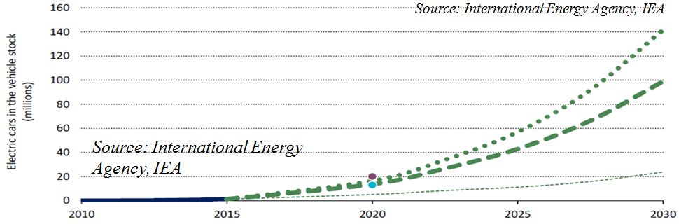 下面這張圖是國(guó)際能源署的預(yù)測(cè),三種情形預(yù)測(cè)2030年全球汽車(chē)保有量,中間這張圖預(yù)測(cè)電動(dòng)汽車(chē)總量達(dá)到1億輛,這樣的預(yù)測(cè)跟中國(guó)目前國(guó)內(nèi)的研究機(jī)構(gòu)包括政府部門(mén)的判斷來(lái)講,這種預(yù)測(cè)就可能是偏保守的預(yù)測(cè)了。