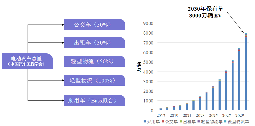 首先是車(chē)輛數(shù)的情況。我們這里采用的一個(gè)總量的數(shù)據(jù)是中國(guó)汽車(chē)工程學(xué)會(huì)做的《節(jié)能與新能源汽車(chē)發(fā)展路線圖》,他預(yù)測(cè)2030年全國(guó)電動(dòng)汽車(chē)總的保有量達(dá)到8千萬(wàn)輛以上,我們就此對(duì)這個(gè)總量進(jìn)行了拆分,左邊這張表里面不同的車(chē)型后面的百分比就是我們認(rèn)為它到2030年之后電動(dòng)汽車(chē)技術(shù)在這類(lèi)車(chē)型中的滲透率情況。右邊這張圖是我們對(duì)2030年之前各類(lèi)電動(dòng)汽車(chē)車(chē)型數(shù)量規(guī)模的預(yù)測(cè),到2030年仍然是電動(dòng)乘用車(chē)的保有量是明顯占據(jù)絕對(duì)的主體。