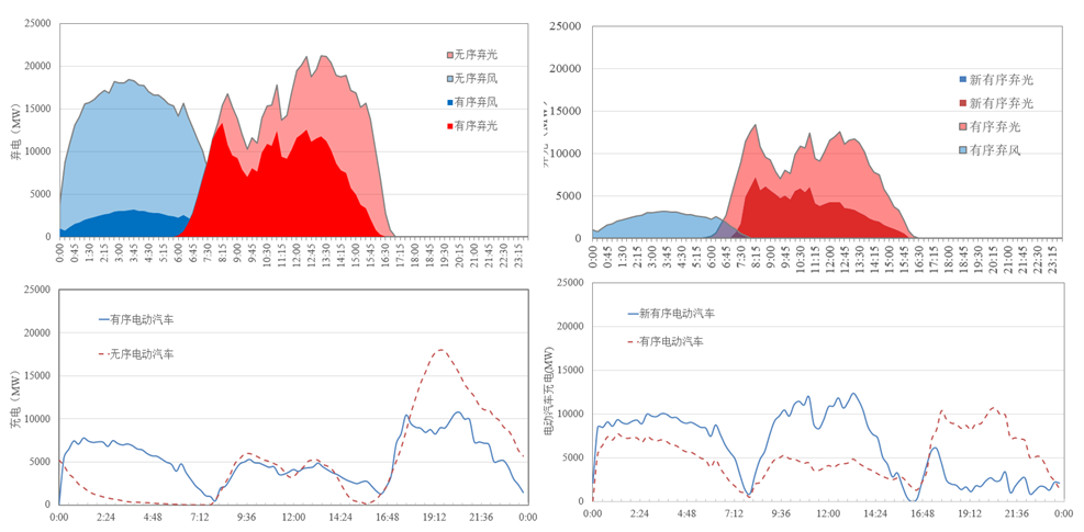 這張圖是我們對(duì)不同充電基礎(chǔ)設(shè)施情景下對(duì)電動(dòng)汽車(chē)系統(tǒng)價(jià)值的分析,左邊這張圖是以有序充電來(lái)看,電動(dòng)汽車(chē)減少棄風(fēng)棄光的效果,藍(lán)色和紅色部分分別是棄風(fēng)棄光一天之內(nèi)波動(dòng)的情況,電動(dòng)汽車(chē)采取有序充電之后,就把更多的傍晚時(shí)間充電負(fù)荷轉(zhuǎn)移到了凌晨,更多的幫助和消納凌晨時(shí)段可能棄掉的峰電。右邊這張圖釋放了白天充電的時(shí)間,因?yàn)樽筮呥@這張圖并沒(méi)有對(duì)白天公共地點(diǎn)的充電沒(méi)有設(shè)置很大的空間,右邊這張圖假設(shè)充電基礎(chǔ)設(shè)施不受限制,用戶可以自由在白天不同的充電基礎(chǔ)設(shè)施選擇他的充電地點(diǎn)之后,右邊這張圖可以更明顯的看到,在左邊這張圖基礎(chǔ)上有更多的傍晚時(shí)段的充電負(fù)荷轉(zhuǎn)移到了日間時(shí)段,就是說(shuō)幫助消納了白天午間時(shí)段太陽(yáng)能發(fā)電的效果。