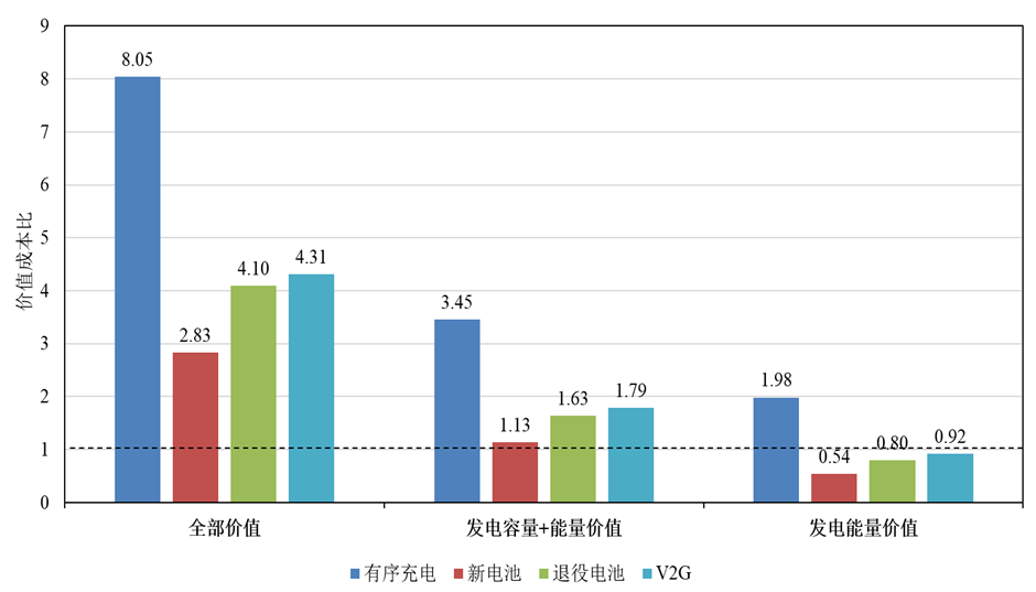 但是我們?cè)谧钭筮呥@個(gè)部分,這四個(gè)柱狀圖里邊,我們包括了電動(dòng)汽車(chē)也好、儲(chǔ)能也好,各類(lèi)價(jià)值的總和,實(shí)際上我們知道,其實(shí)對(duì)比容量?jī)r(jià)值、能量?jī)r(jià)值的時(shí)候,容量?jī)r(jià)值是存在不確定性的,特別是中國(guó)目前是存在發(fā)電容量供大與求這樣的局面,所以到2030年之前是否還是這樣的情況存在一定的不確定性,因此我們?cè)谧钣疫呥@個(gè)圖里邊也是對(duì)單純的發(fā)電能量?jī)r(jià)值進(jìn)行對(duì)比,如果我們完全不考慮容量?jī)r(jià)值之后,單純考慮發(fā)電側(cè),就是新能源發(fā)電廠和火電廠它的這部分獲取的價(jià)值之后,電動(dòng)汽車(chē)的價(jià)值,有序充電還是比較高的水平,其他的各類(lèi)技術(shù)經(jīng)濟(jì)性就非常低了,是低于1的。