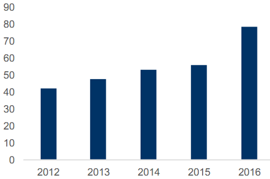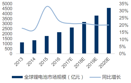 全球市場(chǎng)規(guī)模2020年有望達(dá)到4500億。2016年受新能源汽車政策推動(dòng),我國(guó)鋰離子電池年產(chǎn)量飆升至78億只,同比增長(zhǎng)高達(dá)40%。全球鋰離子市場(chǎng)規(guī)模近年穩(wěn)定上升,2016年全球規(guī)模達(dá)2158億元,2011-2016年復(fù)合增長(zhǎng)率21%。預(yù)計(jì)2020年全球鋰離子電池市場(chǎng)規(guī)模有望達(dá)到4500億元,其中我國(guó)鋰離子電池市場(chǎng)規(guī)模有望達(dá)到3000億元。