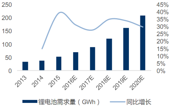 VR、無人機(jī)、可穿戴設(shè)備等新增需求帶動(dòng)消費(fèi)鋰離子電池增長(zhǎng)。盡管傳統(tǒng)手機(jī)、筆記本電腦、數(shù)碼產(chǎn)品等發(fā)展減慢,近年來出現(xiàn)的多種新型產(chǎn)業(yè)增加了對(duì)消費(fèi)鋰離子電池的需求,如VR眼鏡、無人機(jī)、可穿戴設(shè)備等。中國(guó)虛擬現(xiàn)實(shí)(VR)行業(yè)從2015年開始起步,市場(chǎng)規(guī)模正處于飛速擴(kuò)張時(shí)期;根據(jù)預(yù)測(cè),2017年VR行業(yè)規(guī)模將從2016年的約60億元增長(zhǎng)至超過130億元,同比增長(zhǎng)約140%;到2020年預(yù)計(jì)超過550億元,2016-2020年復(fù)合增長(zhǎng)率接近80%。根據(jù)預(yù)測(cè),全球民用無人機(jī)市場(chǎng)規(guī)模也呈快速擴(kuò)張趨勢(shì)。2015年全球民用無人機(jī)市場(chǎng)規(guī)模為36億美元,同比增長(zhǎng)率33%;到2020年,全球民用無人機(jī)市場(chǎng)規(guī)模增長(zhǎng)到約260億美元,五年復(fù)合增長(zhǎng)率近50%。2012年發(fā)布的GoogleGlass,2014年發(fā)布的小米手環(huán),2015年面市的蘋果手表,相繼將智能穿戴推向了風(fēng)口浪尖。根據(jù)預(yù)測(cè),2016-2020年,智能眼鏡出貨量的年復(fù)合增長(zhǎng)率高達(dá)200%左右,智能服裝超過60%,智能手表接近30%。