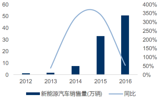 我國(guó)新能源汽車成爆發(fā)式發(fā)展。2014-2015年受政策驅(qū)動(dòng),新能源汽車概念在市場(chǎng)上迅速推廣,我國(guó)新能源汽車銷售量的增長(zhǎng)率均超過300%;2016年銷售量達(dá)51萬輛,同比增長(zhǎng)率也高達(dá)53%。根據(jù)工信部規(guī)劃的2020年我國(guó)新能源年銷量目標(biāo)(200萬輛)估算,2016-2020年復(fù)合增長(zhǎng)率將在40%左右,維持高速增長(zhǎng)趨勢(shì)。