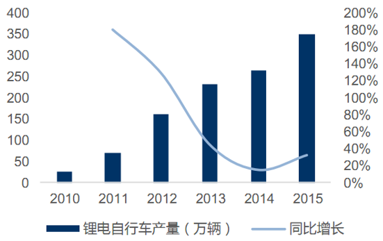 鋰電自行車快速增長(zhǎng)推動(dòng)動(dòng)力電池需求上升。除汽車以外,我國(guó)鋰電自行車產(chǎn)量也在迅速提升,2015年鋰電自行車產(chǎn)量達(dá)350萬輛,同比增長(zhǎng)32%,2010-2015五年復(fù)合增長(zhǎng)率高達(dá)70%。電動(dòng)汽車、鋰電自行車需求的迅速上升,使得動(dòng)力鋰離子電池需求量大幅上升,使之成為帶動(dòng)鋰離子電池行業(yè)增長(zhǎng)的主力。