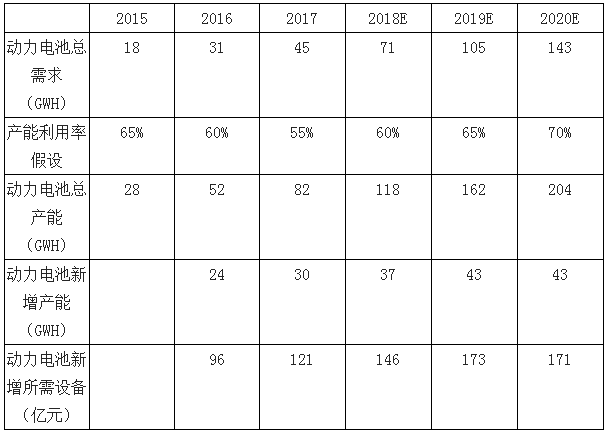 我國(guó)鋰電設(shè)備市場(chǎng)空間2020年預(yù)計(jì)到210億。根據(jù)中國(guó)預(yù)測(cè),假設(shè)動(dòng)力鋰離子電池實(shí)際產(chǎn)能利用率為55-70%,消費(fèi)和儲(chǔ)能鋰電產(chǎn)能利用率90%,到2020年我國(guó)鋰離子電池產(chǎn)能預(yù)計(jì)將超過270GWh。我們假設(shè)每GWh的動(dòng)力鋰電池產(chǎn)能對(duì)應(yīng)的總投資約6億元,其中設(shè)備投資占比65%,而國(guó)產(chǎn)設(shè)備占比到2020年有望提升到100%,則每GWh產(chǎn)能釋放對(duì)應(yīng)的國(guó)產(chǎn)設(shè)備投資約3.9億元,預(yù)計(jì)2020年我國(guó)鋰電設(shè)備規(guī)模約210億元,2016-2020年復(fù)合增長(zhǎng)率約17%。