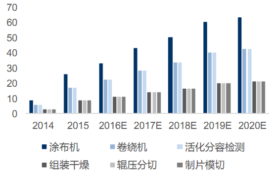 涂布機(jī)、卷繞機(jī)、檢測(cè)設(shè)備產(chǎn)值占比最高。根據(jù)高工鋰電披露的鋰電設(shè)備成本占比分布,屬于前端設(shè)備的涂布機(jī)占比約30%,卷繞機(jī)占比約20%,后端的活化分容檢測(cè)設(shè)備占比約20%,組裝干燥相關(guān)設(shè)備(包括攪拌機(jī))占比10%。結(jié)合該產(chǎn)值比例和預(yù)測(cè)的鋰電設(shè)備市場(chǎng)規(guī)模,計(jì)算出各設(shè)備市場(chǎng)規(guī)模2016-2020年的預(yù)測(cè)值。涂布機(jī)、卷繞機(jī)和活化分容檢測(cè)設(shè)備市場(chǎng)規(guī)模最大,2016年分別在30億元、20億元、20億元左右,2020年預(yù)計(jì)將超過60億元、40億元、40億元。