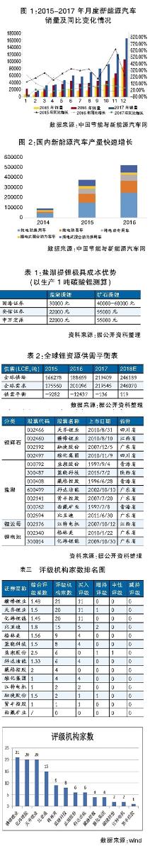 2017年供應(yīng)微幅短缺136噸,處于緊平衡狀態(tài),目前電池級(jí)碳酸鋰價(jià)格較年初上漲6.5%至14萬(wàn),鋰鹽價(jià)格中樞維持偏強(qiáng)概率較大。隨著占據(jù)大部分推薦車(chē)型的第三、四批補(bǔ)貼目錄出臺(tái),政策穩(wěn)步推進(jìn),從目前鋰鹽生產(chǎn)商排產(chǎn)及訂單情況來(lái)看,新能源汽車(chē)在二季度之后銷(xiāo)量增速或逐月抬升,全年來(lái)看,或出現(xiàn)前低后高態(tài)勢(shì),并且3萬(wàn)公里非個(gè)人用戶(hù)的補(bǔ)貼要求,可能會(huì)導(dǎo)致物流車(chē)、客車(chē)等在7-8月份搶裝,鋰鹽價(jià)格持續(xù)上漲動(dòng)力較強(qiáng)。