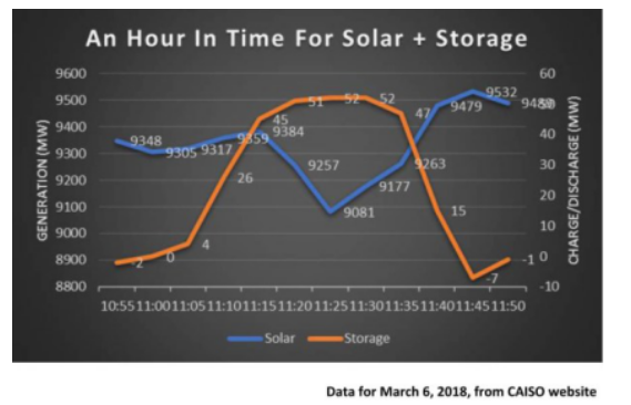 從這個(gè)圖表可以清楚看到,這個(gè)電池儲(chǔ)能系統(tǒng)正在用平滑可變可再生能源產(chǎn)出的短期波動(dòng),在這種情況下是太陽能發(fā)電系統(tǒng)正在運(yùn)行,太陽能光伏發(fā)電量約為9,300兆瓦。然后,隨著太陽能運(yùn)行略微下降,工作人員接入電池,并在接下來的20分鐘內(nèi)將電源注入電網(wǎng)。一旦太陽能發(fā)電系統(tǒng)產(chǎn)生的電力再次增加,運(yùn)營商就重新使用電池的輸出電力。