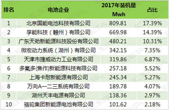 圖2:2017年純電動(dòng)汽車軟包動(dòng)力電池裝機(jī)量排名統(tǒng)計(jì)