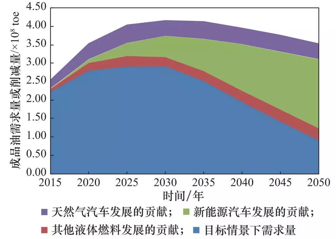 圖 2 大力發(fā)展燃料替代與新能源汽車對(duì)汽車成品油需求削減量的貢獻(xiàn)