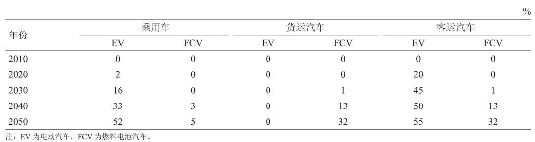 隨著新能源汽車技術(shù)進(jìn)步、成本下降及基礎(chǔ)設(shè)施的不斷完善,新能源汽車市場份額將快速增長,電動(dòng)汽車將逐步替代部分乘用車和大型客車,燃料電池汽車將逐步替代部分乘用車和部分大型客運(yùn)和貨運(yùn)汽車。如果新能源汽車得到大力發(fā)展,根據(jù)模型測算結(jié)果, 2020 年、 2030 年、 2050 年將可分別替代成品油 9.33 × 10^6 toe、 5.71 × 10^7 toe、 1.87 × 10^8 toe 左右。新能源汽車大力發(fā)展時(shí)的占比,如表 1 所示。