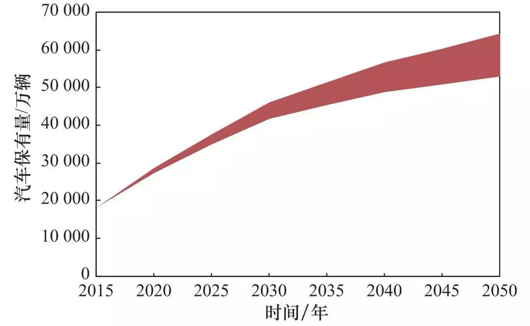 注:帶狀圖表示汽車保有量預(yù)測范圍,由于未來經(jīng)濟(jì)、人口和城鎮(zhèn)化率等驅(qū)動(dòng)因素的不確定性,未來汽車保有量的預(yù)測存在一定變動(dòng)范圍