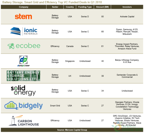 Mercom Capital今天發(fā)布了其關(guān)于電池、智能電網(wǎng)和能效融資的季度報(bào)告。該報(bào)告發(fā)現(xiàn),在2018年第一季度,電池公司的風(fēng)險(xiǎn)資本投資同比增長(zhǎng)5倍,達(dá)到2.99億美元。這2.99億美元是儲(chǔ)能電池公司12輪的風(fēng)險(xiǎn)融資資金。其中最主要的是電池集成商Stem,它在D輪融資從Activate Capital獲得了8000萬(wàn)美元的啟動(dòng)資金。