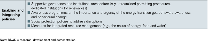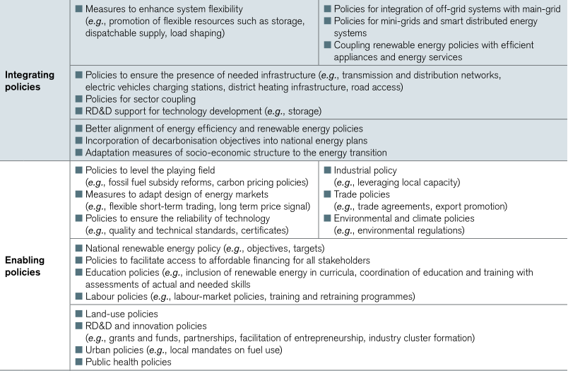 實(shí)現(xiàn)能源轉(zhuǎn)型,需要的不僅僅是針對(duì)能源部門制定的政策更為全面。能源領(lǐng)域的迅速變化需要一種新的政策分類方式,這涉及到能源系統(tǒng)的轉(zhuǎn)變和它賴以生存的社會(huì)經(jīng)濟(jì)結(jié)構(gòu)的轉(zhuǎn)變。這期間的政策需要采取綜合辦法,兼顧這兩個(gè)方面。隨著可再生能源從利基轉(zhuǎn)向主流,推動(dòng)轉(zhuǎn)型的政策不僅必須涵蓋可再生能源的部署,還必須納入影響可持續(xù)性和轉(zhuǎn)型速度的更廣泛的能源系統(tǒng)和經(jīng)濟(jì)政策。
