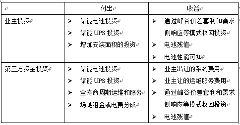 當(dāng)數(shù)據(jù)中心想做成儲能型的數(shù)據(jù)中心,其投資模式亦可發(fā)展改變。如果建設(shè)數(shù)據(jù)中心的業(yè)主愿意投資,則可以投資并獲得全部收益;如果業(yè)主覺得看不清楚趨勢,尚有風(fēng)險(xiǎn),亦可由第三方資本進(jìn)行投資,做合同能源管理(EMC),具體的投資收益分成,業(yè)主可以和第三方資本協(xié)商。筆者通過下表簡單分析了分別由業(yè)主自己投資和第三方資本投資各自所付出的以及所得到的回報(bào),供大家參考,不排除未來更靈活的收益模式或更豐富的合作模式!