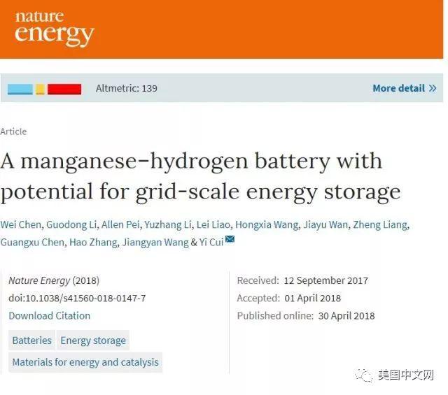 4月30日,在《自然》雜志旗下的《自然-能源》上刊發(fā)的一篇學(xué)術(shù)文章,引起全球能源界巨大關(guān)注。來(lái)自斯坦福大學(xué)的一項(xiàng)最新研究成果為大規(guī)模儲(chǔ)能帶來(lái)新希望。該校材料系著名華裔教授崔屹實(shí)驗(yàn)組發(fā)明的新型水電池——錳氫氣電池(Mn-H)——可循環(huán)使用超過(guò)1萬(wàn)次!其低成本、長(zhǎng)壽命、高能量密度的潛在性能將有望在大規(guī)模儲(chǔ)能領(lǐng)域帶來(lái)巨大變革。