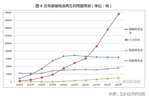 就鋰電池再生利用而言,可供再生利用的廢舊鋰電池來源不僅來自直接報廢的退役動力電池,還有廢舊的消費鋰電池、電池企業(yè)等的生產(chǎn)廢料、報廢的梯級利用電池等重要來源。經(jīng)過測算,未來 5 年內(nèi)主要的再生利用電池仍然是缺乏回收價值的磷酸鐵鋰電池。但三元動力電池的再生利用量將從 2020 年開始快速放量,并超過消費鋰電池的再生利用量;從 2023 年開始,三元動力電池將進(jìn)一步超過磷酸鐵鋰電池成為再生利用的主要對象。