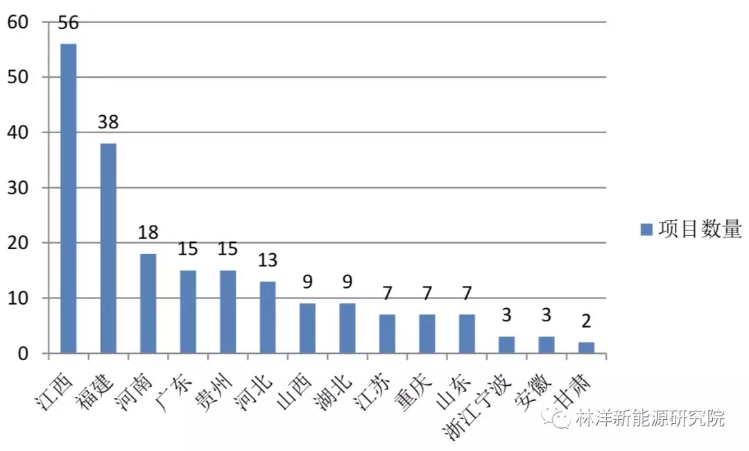 在項目數(shù)量上,江西和福建項目最多,分別為56個和38個項目。安徽和甘肅最少分別只有3個和2個。
