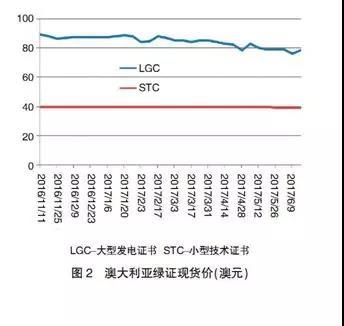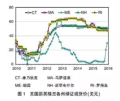 各國綠證交易價格主要受證書供需形勢影響,同時也與可再生能源發(fā)電技術類型、季節(jié)波動、監(jiān)管懲罰強度等多種因素相關,具有較大的差異性和波動性。從美國新英格蘭地區(qū)各州的綠證現(xiàn)貨價格來看,馬薩諸塞、羅得島、康乃狄克和新罕布什爾州的綠證供應在2013~2015年期間供應偏緊,單位綠證的交易價格達50~60美元,而同期的緬因州由于生物質(zhì)發(fā)電計入綠證核發(fā)范圍、綠證供應顯著高于需求,價格降至10美元以下。澳大利亞大型發(fā)電技術證書價格因供應增加,自2016年下半年以來震蕩下行,但截至2017年6月仍高于75澳元;小型技術證書則主要受限價、罰款等因素影響,一直保持在最高限定價格40澳元附近。此外,從部分國家和地區(qū)的交易市場來看,風電由于成本和價格較低在早期時是綠證交易主體,太陽能發(fā)電由于價格快速下降、有取代風電成為交易主體的趨勢(見圖1、圖2)。