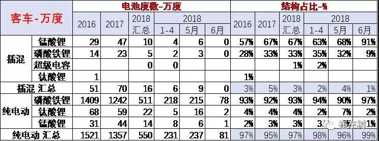 18年客車需求恢復(fù)較快,客車仍是電池需求的重要主力。從產(chǎn)量結(jié)構(gòu)的變化看,18年6月的客車產(chǎn)量占比7%,但6月的客車用電池占比達(dá)到28%,相對(duì)17年6月的39%電池用量下降很大。