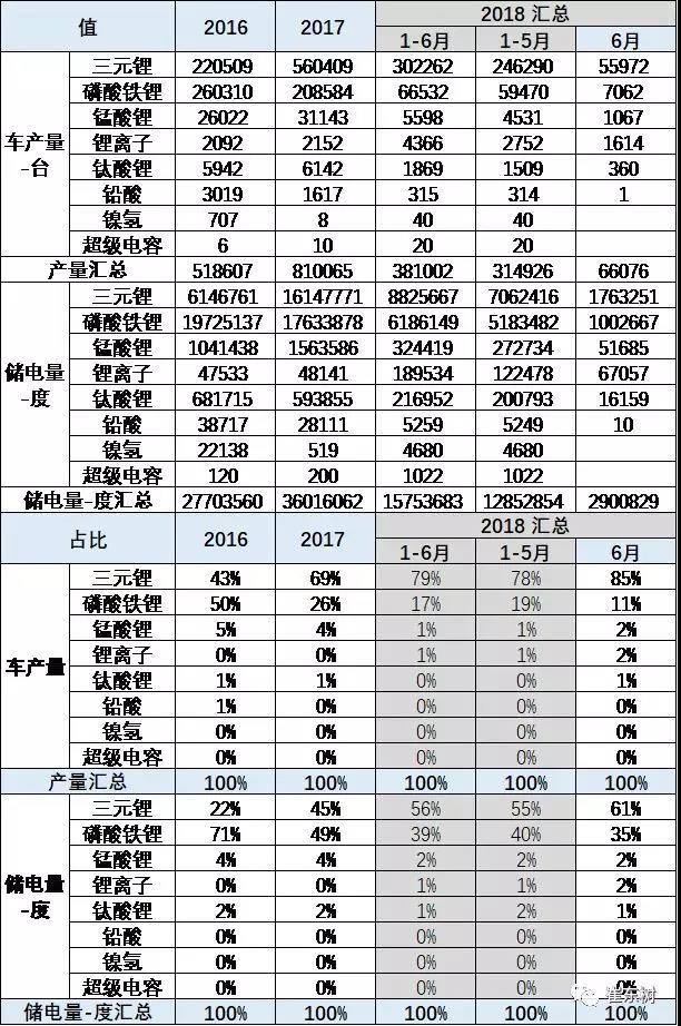 2018年1-6月的三元電池占比達(dá)到56%,要17年的45%提升11個(gè)百分點(diǎn),17年較16年的22%也提升了20個(gè)百分點(diǎn)。而錳酸鋰和鈦酸鋰的需求逐步減弱。但6月的磷酸鐵鋰到61%,也是合理回歸。