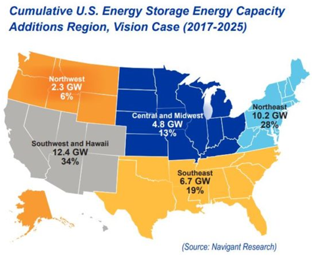 如今,人們看到加利福尼亞州、紐約州、馬薩諸塞州、新澤西州政策變化將會促進儲能發(fā)展。因此,機會無處不在。每個市場都有獨特的驅(qū)動因素,儲能將以不同的方式適應不同的市場。在太平洋西北地區(qū),水力發(fā)電擁有大量蓄能,其儲能的使用方式與德克薩斯州風力發(fā)電和需要管理高度間歇性太陽能發(fā)電資源的州有所不同。