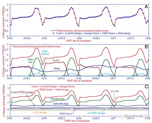 圖1:100%新能源供電的美國(guó)電網(wǎng)在冬季中四天的運(yùn)行狀況:(A)系統(tǒng)的總負(fù)荷和總發(fā)電和供熱曲線;(B)各種源的發(fā)電和發(fā)熱曲線;(C)各種負(fù)載,儲(chǔ)能,以及損耗的需求曲線。