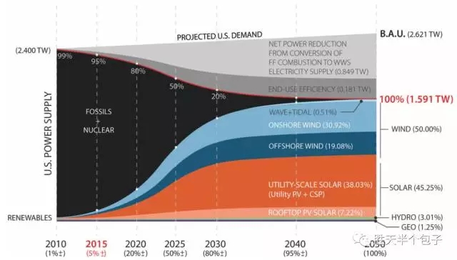 美國(guó)在2016年總的用電量接近4萬(wàn)億千瓦時(shí),而包括水電在內(nèi)的清潔能源只提供了其中的15%,因此要在2050年轉(zhuǎn)變?yōu)?00%新能源供電,難度之大是無(wú)法想象的。