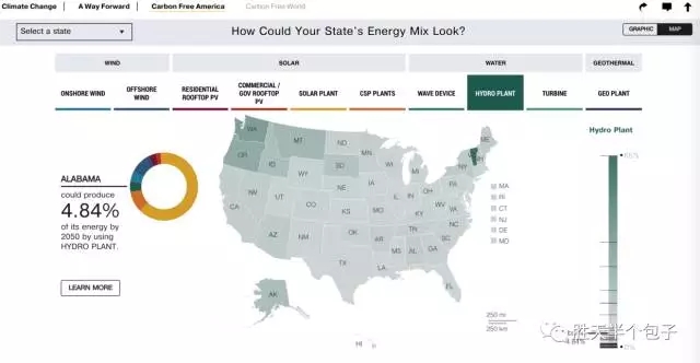 此外,雅各布森教授還和美國(guó)國(guó)家地理雜志共同推出了一個(gè)網(wǎng)頁(yè)來(lái)展示其在第一篇文章中所設(shè)計(jì)的美國(guó)各州的100%新能源之路。不得不稱贊的是網(wǎng)頁(yè)設(shè)計(jì)的清晰明了,視覺(jué)沖擊強(qiáng)烈,讓讀者能夠感受到新能源發(fā)展的勢(shì)在必行。