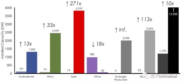 (2)風(fēng)、光、水、儲(chǔ)等新增能源的建設(shè)都是極其巨大的。如下圖所示,新增的風(fēng)、光、水、儲(chǔ)的容量將分別是2015年已有容量的33倍,271倍,13倍,以及113倍;