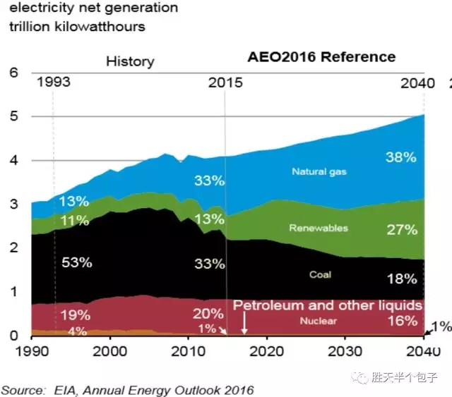 另外,無(wú)論是雅各布森教授還是克拉克的研究都忽視了另外一個(gè)重要的能量來(lái)源--天然氣。由于天然氣價(jià)格的大幅下降,以及其本身所具有的啟動(dòng)速度快,排放低,效率高等優(yōu)點(diǎn),近年來(lái)得到了越來(lái)越多的重視,并新建了很多天燃?xì)怆姀S。在美國(guó)能源信息署做的預(yù)測(cè)中,2040年天然氣發(fā)電在電網(wǎng)中將占比38%。對(duì)比來(lái)說(shuō),美國(guó)能源信息署所做的預(yù)測(cè)才是符合市場(chǎng)發(fā)展預(yù)期的,也更有指導(dǎo)意義。
