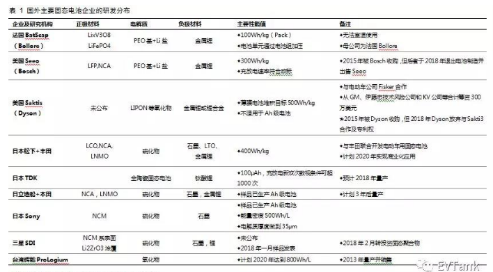 法國Bollore公司的EV“Bluecar”配備其子公司Batscap生產(chǎn)的30kwh金屬鋰聚合物電池,采用Li-PEO-LFP材料體系,巴黎汽車共享服務(wù)“Autolib”使用了約2900輛Bluecar,這是世界上首次用于EV的商業(yè)化全固態(tài)電池。豐田開發(fā)出全固態(tài)鋰離子電池,能量密度為400Wh/kg,計(jì)劃在2020年實(shí)現(xiàn)商業(yè)化;松下的最新固態(tài)電池能量密度相對提高了3~4倍;德國KOLIBRI電池應(yīng)用于奧迪A1純電動汽車,目前尚未商業(yè)化應(yīng)用。