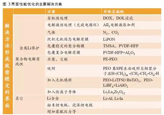 固體電解質(zhì)存在與電極間界面阻抗大,界面相容性較差,同時充放電過程中各材料的體積膨脹和收縮,導(dǎo)致界面容易分離等問題。使用鋰金屬負(fù)極也存在固相接觸阻抗大,界面反應(yīng),效率低等問題。目前解決的主要方向如下: