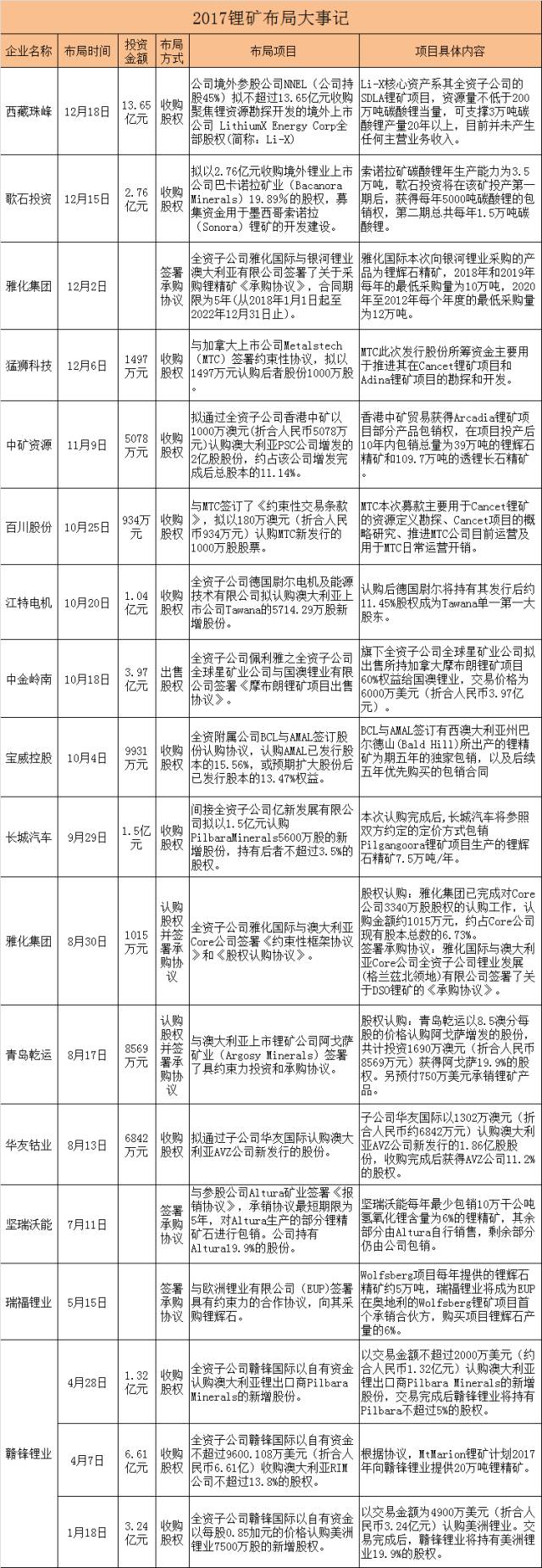 以下為中國(guó)企業(yè)2017年海外布局鋰礦項(xiàng)目: