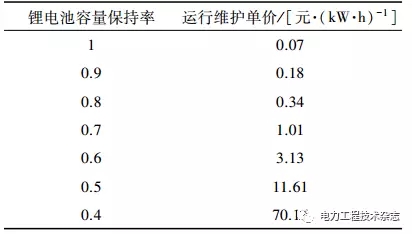 表1 不同容量保持率的鋰電池對應(yīng)的運(yùn)行維護(hù)單價