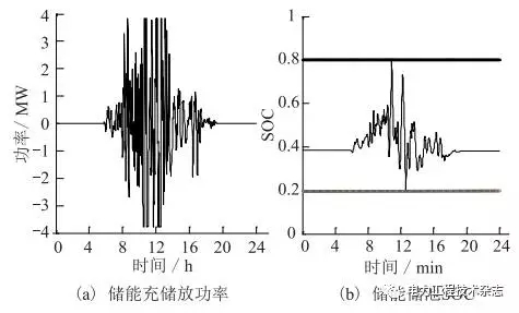 圖3 儲能電池充放電功率以及荷電狀態(tài)變化曲線