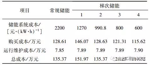 由所述計算梯次電池等效循環(huán)壽命的方法, 根據(jù)儲能電池的荷電狀態(tài)計算得到電池在該典型日內(nèi)的等效完全充放電次數(shù)Nday=3.3502次。通過計算得到配置常規(guī)儲能系統(tǒng)和梯次儲能系統(tǒng)的成本,同時對比梯次儲能系統(tǒng)單位容量分別為990.8元/(kW·h)、800元/(kW·h)、600元/(kW·h)時的情況,得到如表3所示的經(jīng)濟(jì)性對比結(jié)果。