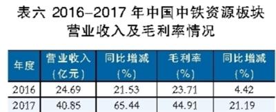 近年來,中國中鐵一直力推多元化經(jīng)營,也取得了不斐成績。2017年,中國中鐵的礦產(chǎn)資源板塊實(shí)現(xiàn)收入 40.85 億元,同比增長 65.44%;毛利率為 44.91%,同比增加 21.19 個(gè)百分點(diǎn)(見表六)。