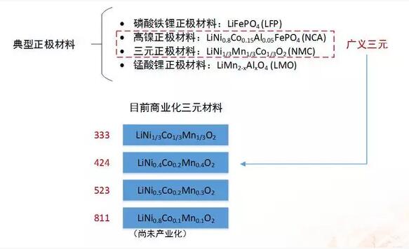 可以看到我發(fā)出的這張圖中,用紅框標(biāo)出來(lái)的是三元電池的一個(gè)分類,與它的一個(gè)組成。在三元電池當(dāng)中實(shí)際還分了很多種,以它三種元素配比的不同分別分為333、424、523、811,還有NCA這種細(xì)分的一個(gè)產(chǎn)品。所以就它內(nèi)部來(lái)說(shuō),這個(gè)材料還是有很大的改善空間。