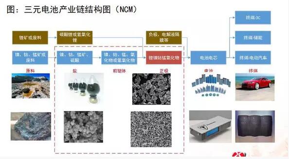 這張圖是三元電池的產(chǎn)業(yè)鏈結(jié)構(gòu),我們可以看到它和磷酸鐵鋰電池最大的不同是它會(huì)用到鎳鈷錳等小金屬。對(duì)于其他的來(lái)說(shuō),可能像碳酸鋰負(fù)極電解液隔膜這些是比較接近的。所以說(shuō)正極材料這一塊會(huì)是他們相差比較大的領(lǐng)域,這也是我們關(guān)注的投資熱點(diǎn)之一。