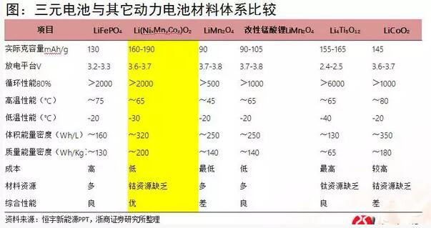 如果我們把三元電池與其他動(dòng)力電池材料進(jìn)行對(duì)比,我們可以看到它的優(yōu)點(diǎn)是非常突出的。它最大的優(yōu)點(diǎn)是能量密度高,可以緩解里程憂慮,增加汽車的續(xù)航里程。第二點(diǎn)優(yōu)勢(shì)是它的放電電壓高,輸出功率比較大。第三點(diǎn),是它的低溫性能非常好,可以適應(yīng)全天候的氣溫,在北方是更加適用些。