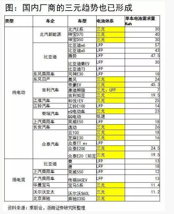 根據(jù)我們對(duì)于中國(guó)市場(chǎng)再售新能源車型的統(tǒng)計(jì)來(lái)看,除了比亞迪和上汽外,其他廠商已經(jīng)全面轉(zhuǎn)向三元了,比亞迪也是從今年開始開始測(cè)試三元電池,上汽在E50上已經(jīng)開始使用三元電池,未來(lái)它的下一代也會(huì)全部換用三元電池。所以可以說(shuō),未來(lái)2年國(guó)內(nèi)廠商推出的新能源汽車會(huì)絕大部分選用三元電池。