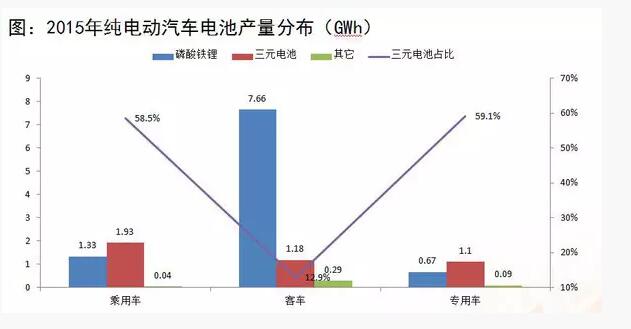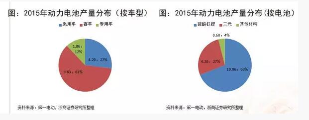 2015年中國(guó)市場(chǎng)動(dòng)力電池出貨量大概是15.7G瓦時(shí),同比增長(zhǎng)324%,其中三元電池是大概4.26G瓦時(shí),占27%。磷酸鐵鋰10.86G瓦時(shí),占比69%,其他的材料就占比非常少了,這兩種電池的占比,也是和乘用車和客車以及專用車這個(gè)占比是非常一致的,因?yàn)樵诳蛙嚿厦娆F(xiàn)在主要應(yīng)用的還是磷酸鐵鋰。所以說(shuō)在之前客車出貨量比較大的時(shí)候,磷酸鐵鋰是占了一個(gè)大頭。