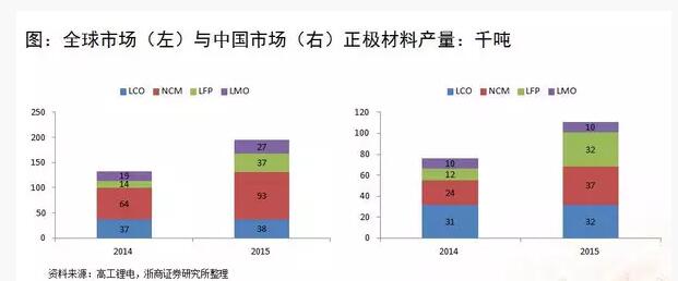 在整個(gè)三元素電池的體系中,最重要的還是正極材料。2015年正極材料,整個(gè)中國(guó)廠商的正極材料出貨量是3.7萬(wàn)噸。其中用在動(dòng)力電池上的占比大概是九千四百噸占了整個(gè)需要的25%。而對(duì)各個(gè)不同類型的設(shè)計(jì)材料進(jìn)行對(duì)比來(lái)看,2015年新能源汽車的需求是正極材料增長(zhǎng)的最大的動(dòng)力,其它的部分基本上是沒有增長(zhǎng)。