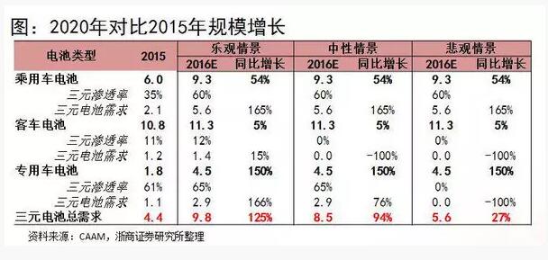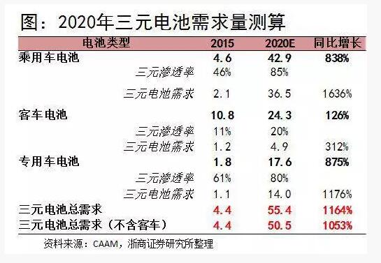 即使假設(shè)中國(guó)政府對(duì)三元電池在客車上的使用不解禁,2020年三元電池需求也將會(huì)達(dá)到50.5 GWh,對(duì)比2015年增長(zhǎng)10.5倍。